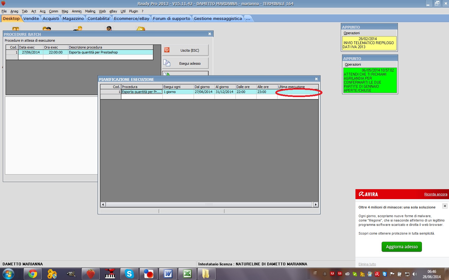 Citazione: lasciando aperta anche la finestra che pianifica l'esecuzione negli orari Questa finestra andava lasciata chiusa, altrimenti le procedure automatiche non partono.  Andava lasciata aperta solo la finestra sotto con titolo "PROCEDURE BATCH"