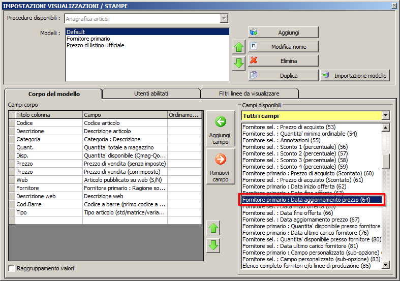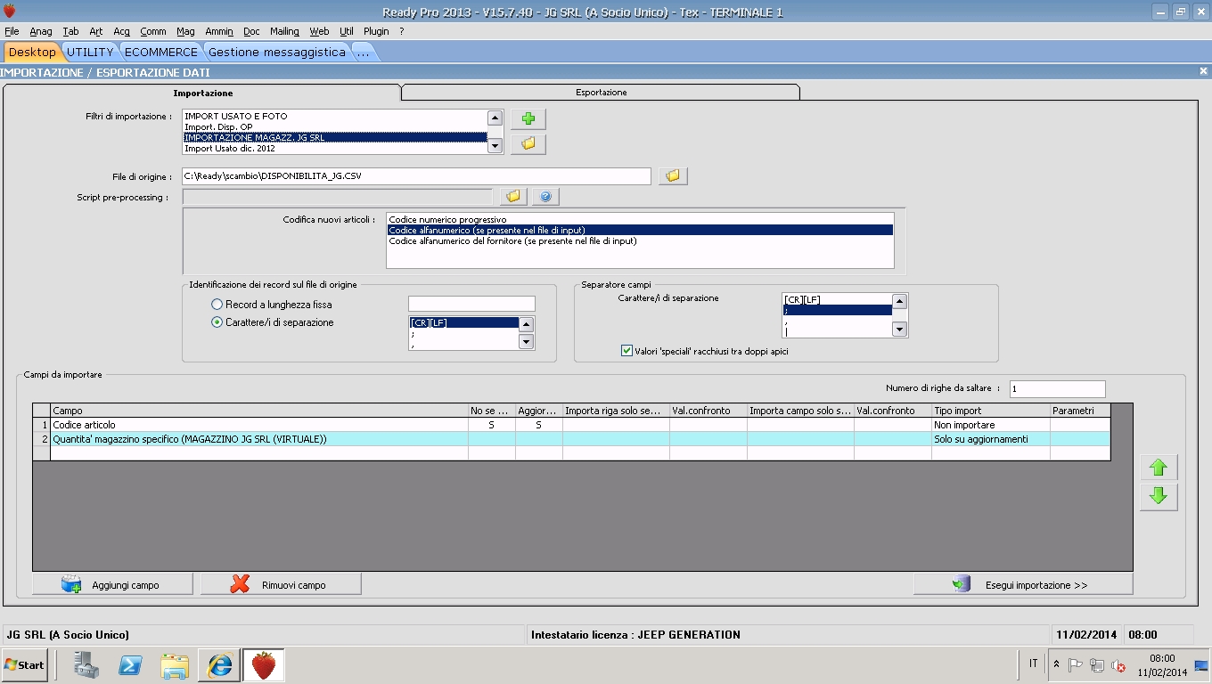 Ciao a tutti Poiche' abbiamo 2 aziende gestite con readypro abbiamo creato, con il vs aiuto, la seguente procedura per tenere la DISPONIBILITA' di entrambi i magazzini costantemente aggiornati nella medesima schermata "visualizzazione lista articoli": 1) Sotto ambiente AZIENDA 1 esportiamo la DISPONIBILITA' 2) Sotto ambiente AZIENDA 2 IMPORTIAMO la DISPONIBILITA' di AZIENDA 1 appena esportata 3) Aggiorniamo online TUTTE le disponibilità di ENTRAMBE LE AZIENDE Anche se un po' farraginoso funziona bene... Il problema è che ci siamo accorti che la "Data Ultima Modifica" di ogni articolo viene sempre settata con la data dell'ultima esportazione/importazione (in pratica tutti gli articoli riportano questa data vanificando l'utilità di sapere quando è stato variato un prezzo o una descrizione). Il problema ce l'abbiamo sulla visualizzazione in lista articoli (dove posso scegliere di visualizzare solo DATA CREAZIONE - DATA ULTIMA MODIFICA e DATA RIFERIMENTO). Qualche idea?