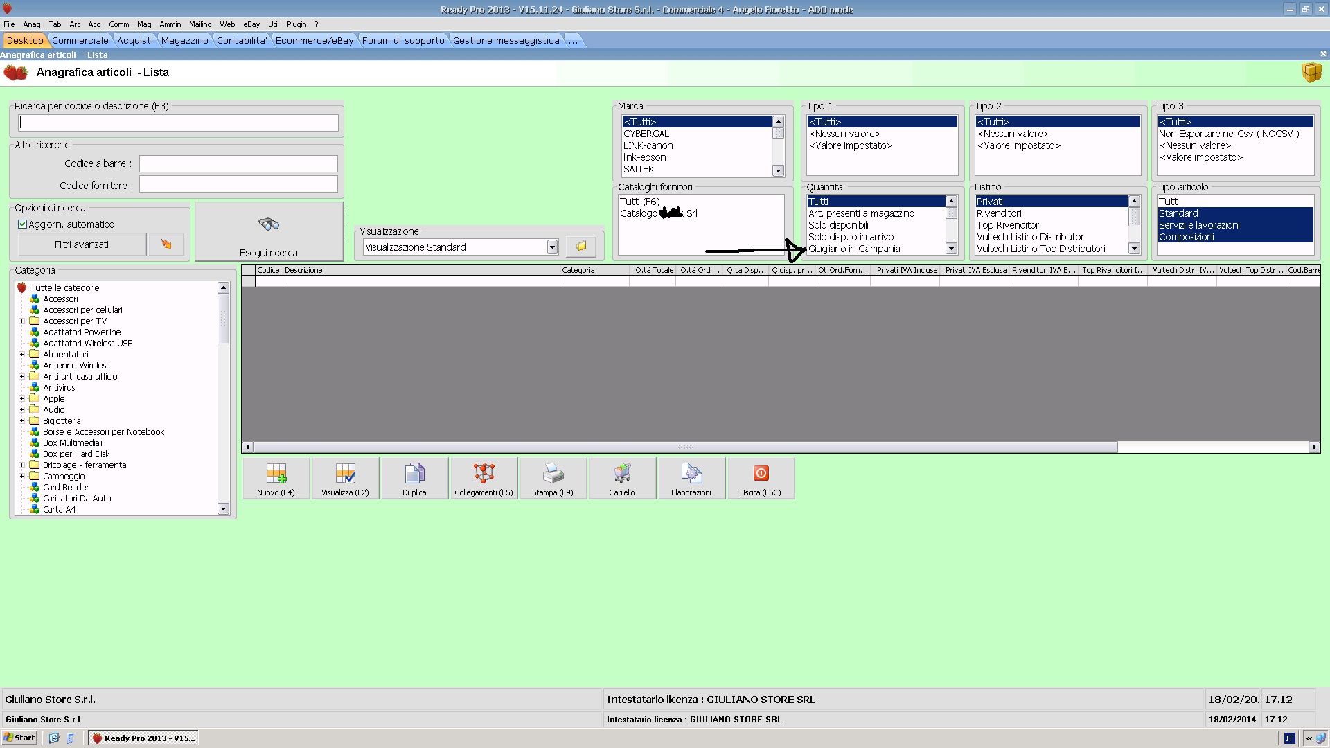 Bhe si, che di default ci sia il magazzino "Giugliano In Campania" e che all'occorrenza si possa scegliere anche gli altri magazzini virtuali. Ti spiego tutti noi utilizziamo solo questo magazzino, tranne per un collega che all'occorrenza riceve ordini da uno dei nostri siti web dove per l'appunto sono collegati i magazzini virtuali. Quindi come ti dicevo, visto che al 90%, utilizziamo questo magazzino, sarebbe decisamente molto più pratico visualizzare solo questo. Poi all'occorrenza quando serve di switchare e scegliere gli altri magazzini o tutti. Spero di aver reso bene l'idea adesso.