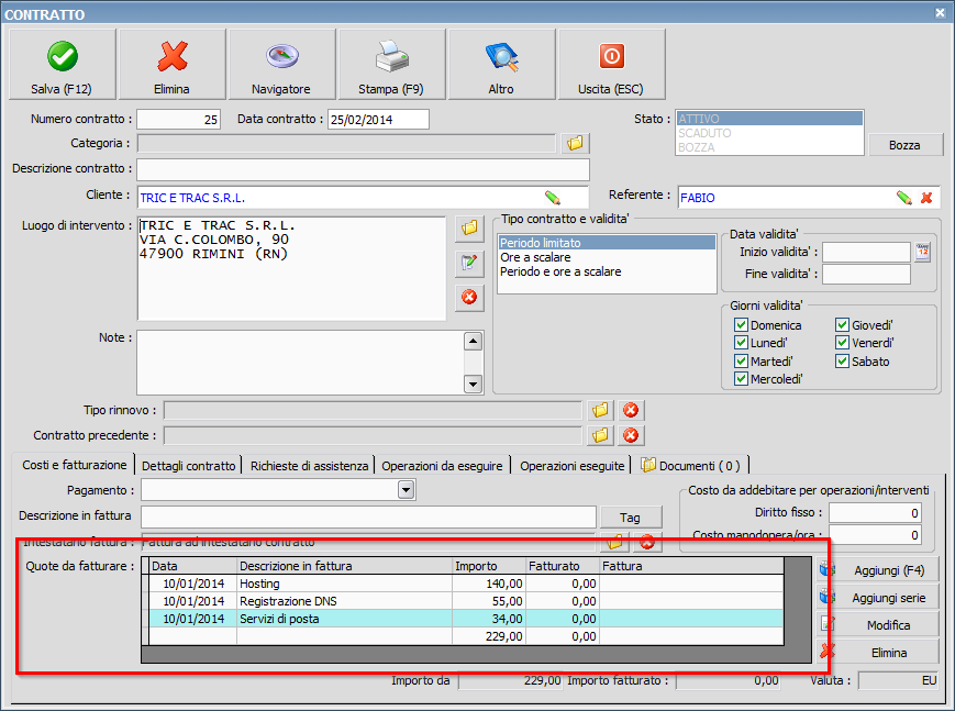 Abbiamo la necessità di creare un contratto annuale di hosting che si rinnovi appunto annualmente e dove il servizio di hosting viene fatturato tramite 3 articoli servizio (hosting, registrazione dns , servizi di posta).