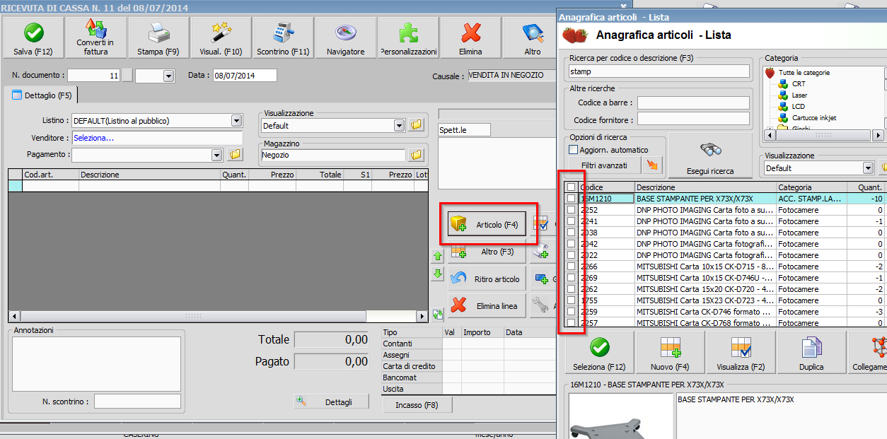 Salve . Ho riscontrato un problema nel la vendita al banco , vendendo articoli senza codice a barre , quando devo andarli a cercare con il tasto aggiungi articolo nel menu a tendina non appare il box che permette di selezionare piu' articoli contemporaneamente , cosa che avviene se si accede allo stesso menu tramite preventivi, ordini ecc. , in questo modo non posso usufruire del comodo tasto di articoli collegati che con un solo click mi permetterebbe di selezionare tutti gli articoli che probabbilmente il cliente sta acquistando.
