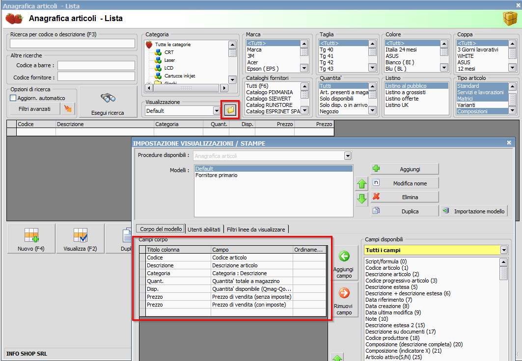 Citazione: Stavo provando a caricare dei prodotti tramite la funzione 'cataloghi' e il software mi restituisce l'errore 3265. A cosa può essere dovuto?! Direi che sul catalogo esterno sembra tutto ok. Puoi mostrarci uno screenshot dei campi configurati sulla visualizzazione in lista articoli? L'errore compare con qualsiasi tipo di ricerca?