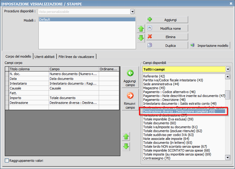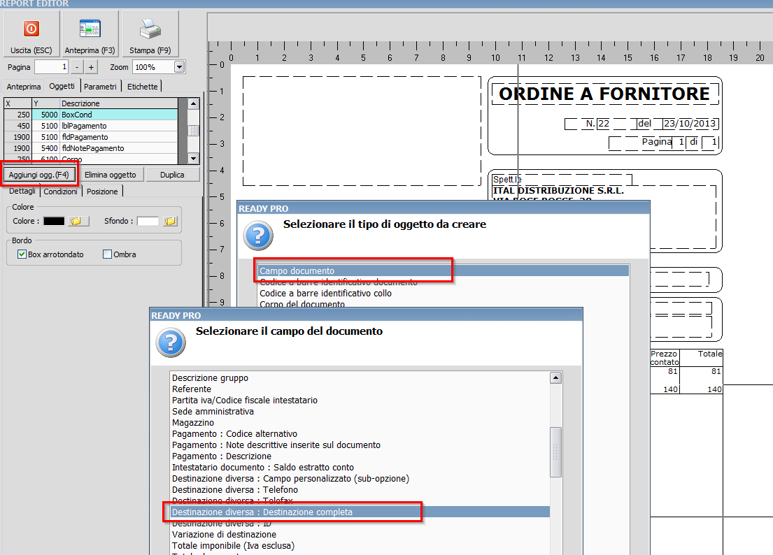 Per modificare il modulo di stampa va utilizzata la procedura UTIL / REPORT EDITOR, aggiungendo il campo con la destinazione all'interno del modello di stampa, come mostrato in figura