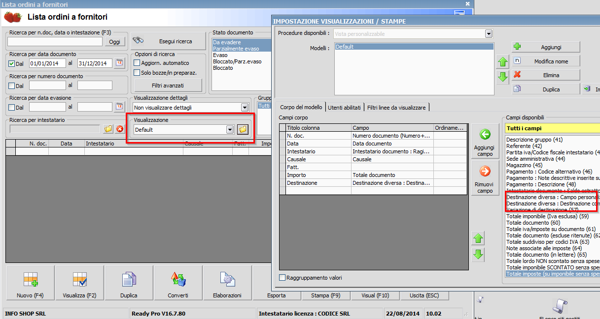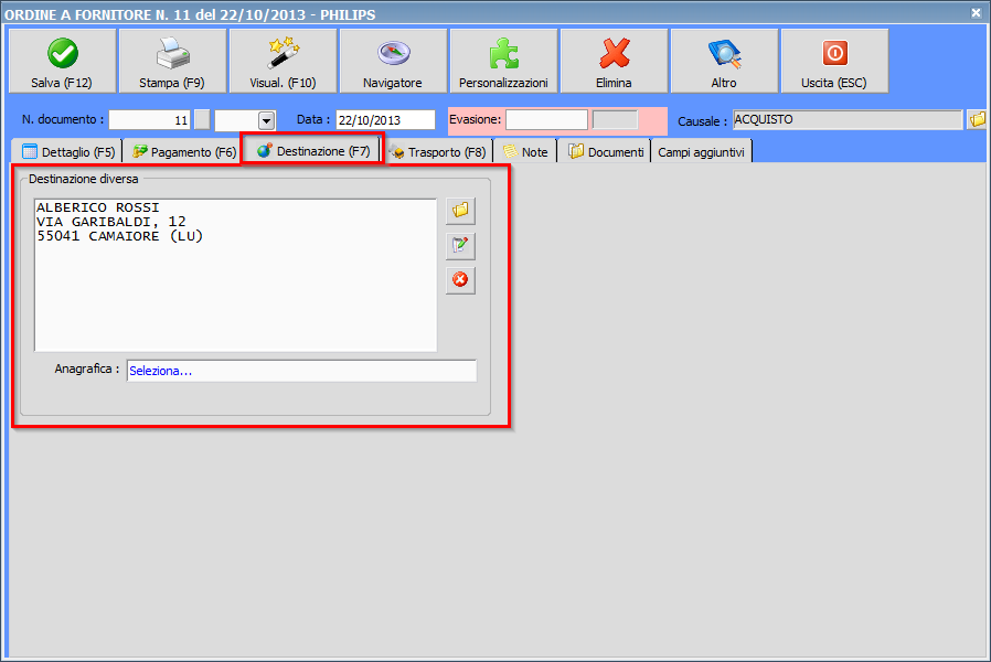 Se entro dentro qualsiasi procedura legata agli ordini fornitori nella lista dei campi disponibili non figura la destinazione diversa.
