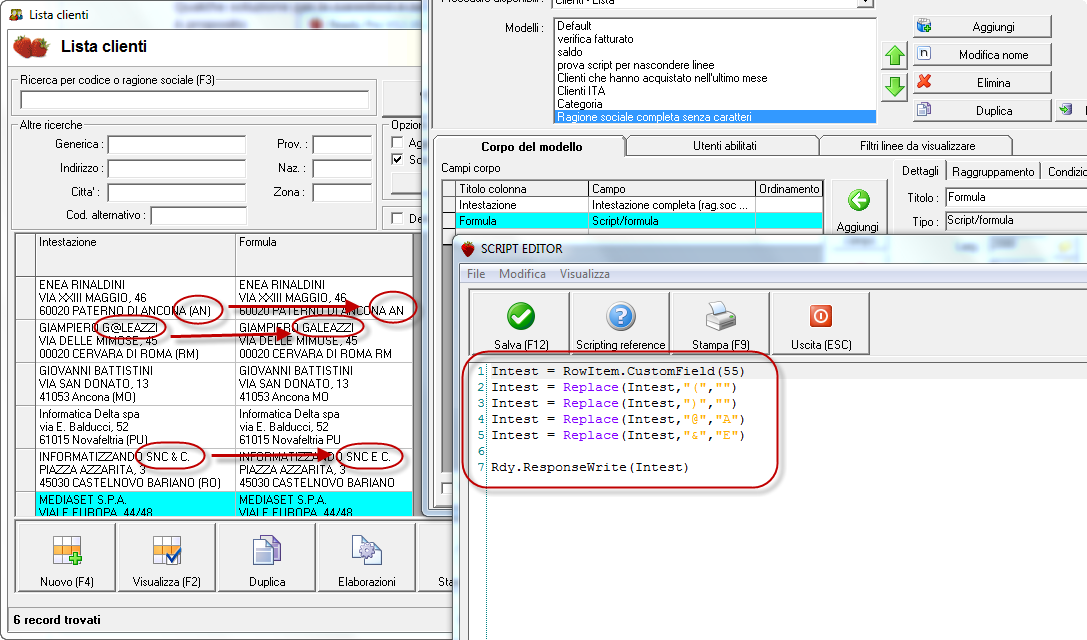1 - Le poste non vogliono che nella linea dell'indirizzo siano contenuti caratteri speciali e purtroppo le parentesi sono uno di quelli In pratica il classico 20100 - MILANO (MI) dovrebbe diventare 20100 MILANO MI Si può modificare il formato dell'indirizzo completo fornito dall'editor. E' molto importante che sia il campo indirizzo completo in quanto esso fornisce anche la possibilità che se esistono righe vuote non lascia spazi nell'indirizzo. Se io invece inserissi i singoli campi, a parte il lavorone nel rifare 6 o 7 moduli, non risolverei il problema delle linee mancanti. Mi spiego meglio. Come avevamo approfondito tempo fà le poste vogliono gli interni, le scale, ecc che siano posizionati prima della via. Esempio INT. A SCALA 3 VIA LE MANI DAL NASO 5 20100 MILANO MI Per fare questo ho dovuto inserire appunto gli interni nella prima riga dell'indirizzo e l'indirizzo reale nella seconda. Appunto, il campo indirizzo completo, se non trova un contenuto nella prima riga, furbamente, non lascia la riga vuota.