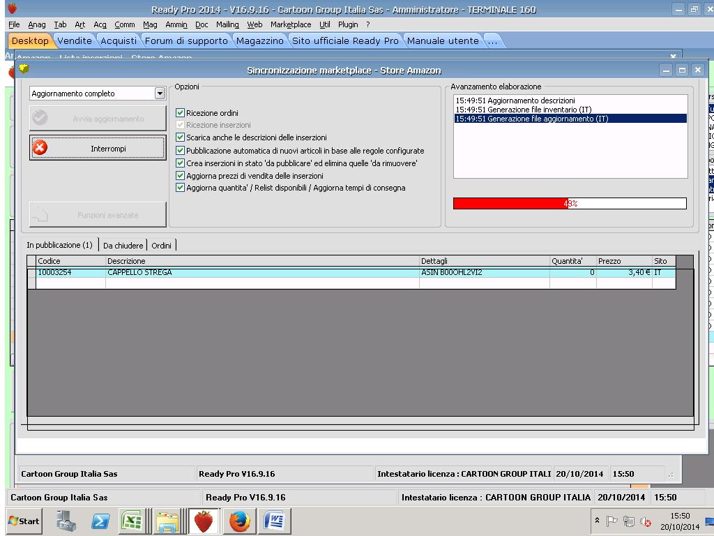 la prima volta che quest mattina ho provato a fare gli aggiornamenti tutte le macchine erano ferme. mi viene in mente una cosa, tutti lavoriamo su un serve, potrebbe essere che si sia impallato su questa procedura il server proprio? Un'ultima cosa, dopo i due messaggi comunque genera ugualmente il file da mandare ad Amazon per aggiornare le quantità e i prezzi, in pratica non riceve le informazioni da Amazon come ad esempio ho pubblicato con il file Excel circa 520 articoli, questi articoli non risultano ancora su Ready pubblicati su Amazon.
