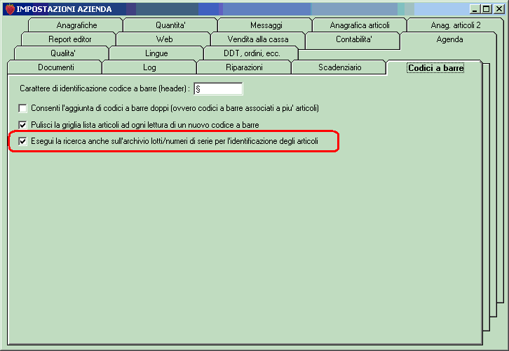 Comunque, dopo la tua richiesta a Glauco della scorsa settimana, abbiamo apportato delle modifiche e, a partire dalla versione 6.12.11 (che troverai disponibile per il download in serata) sara' disponibile una nuova opzione in 'impostazioni azienda' per fare in modo che l'identificazione degli articoli tramite codice a barre venga eseguita anche con una ricerca tra i numeri di serie ed i lotti presenti in archivio. Questa opzione di default sara' disattivata (soprattutto perche' in presenza di archivi con diverse decine di migliaia di numeri di serie la ricerca potrebbe risultare troppo lenta)