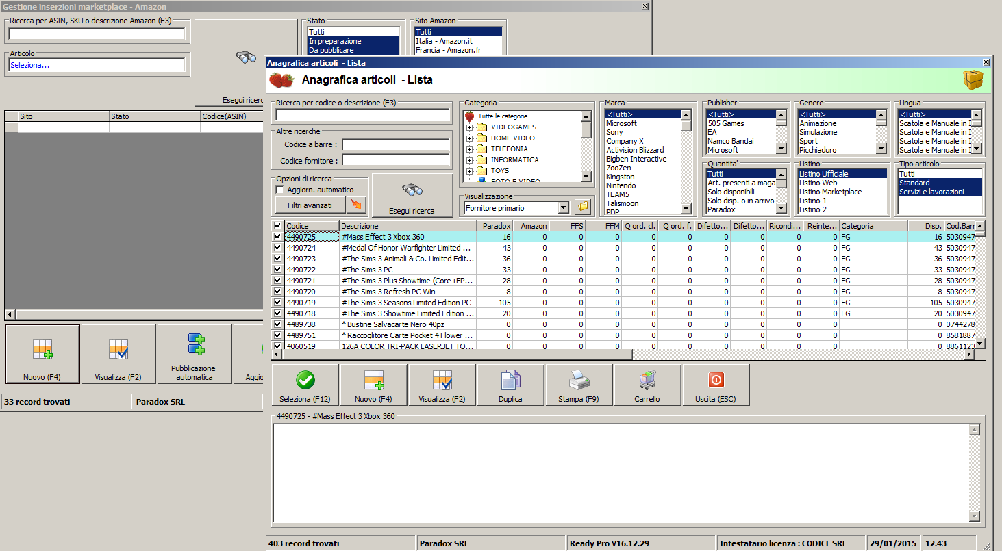 Citazione: ho appena provato selezionando la categoria fg e selezionando tutti gli articoli e non mi crea nulla su Ready. Gli articoli della categoria "FG" NON hanno un codice EAN / UPC valido (puoi identificarli dal fatto che a fianco c'e' scritto GENERICO e non EAN o UPC)