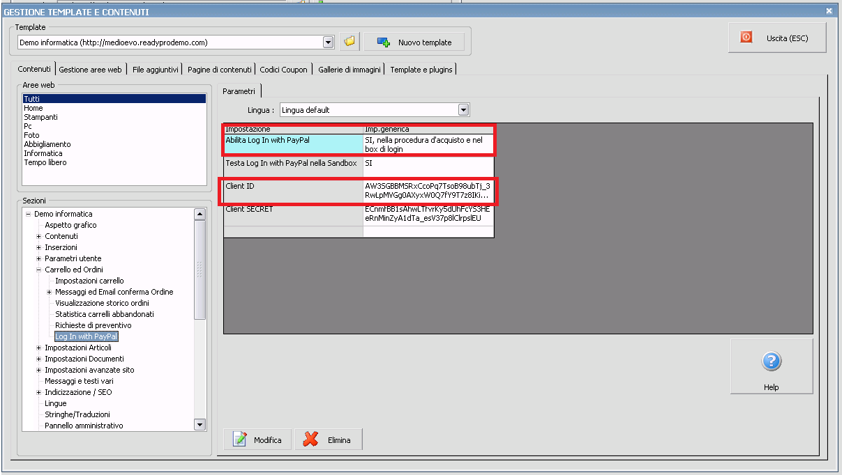 Citazione: ho provato ad effettuare la procedura di configurazione ma da il seguente errore come da immagine: Controlla di aver inserito il Client ID corretto (l'errore è molto chiaro). Sei sicuro di aver preso i dati relativi alla parte "Live credentials" e non a quelli per la Sandbox? http://help.readypro.it/manual.php/it/1419/log-in-con-paypal