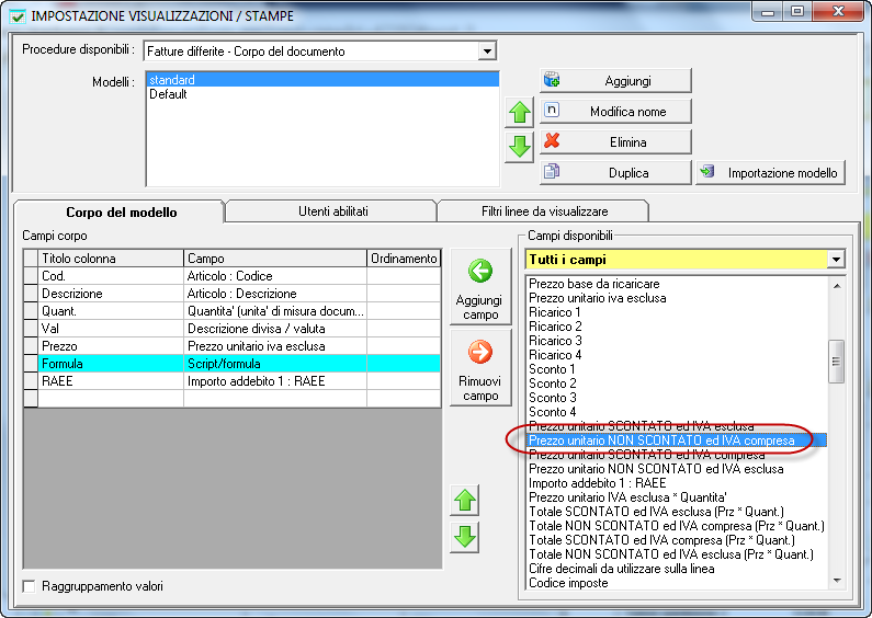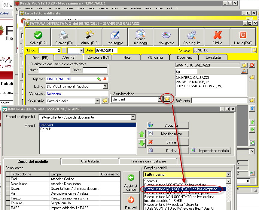 Citazione: mentre quello che a noi necessita, vendendo IVATO al pubblico ed emettendo ricevute fiscali o fatture a mano e non importandole da sito, è quello di inserire il prezzo di vendita in apposita casella. Il programma utilizzato ad oggi ha i campi imponibile ed ivato, per ogni prodotto, sia esistente che per una riga generica (prodotto non caricato in deposito) Allora ritorna valida la mia prima risposta: devi aggiungere nella visualizzazione del corpo documento il campo PREZZO UNITARIO NON SCONTATO IVA COMPRESA: