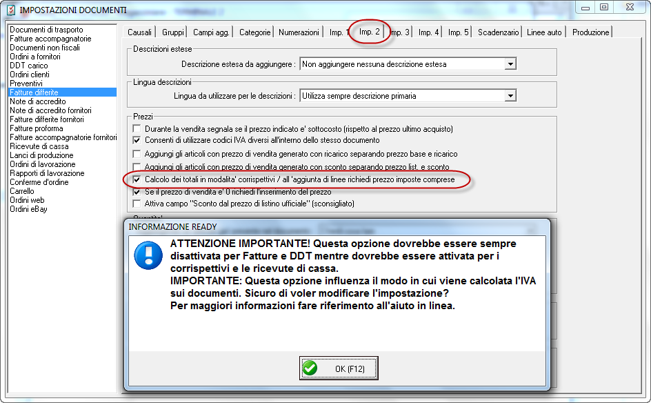 Inoltre quando aggiungi una linea libera Ready ti chiede di specificare il prezzo di vendita: in questo caso se vuoi inserirlo compreso di IMPOSTE allora devi attivare l'opzione che trovi in UTIL > IMPOSTAZIONI DOCUMENTI > IMP. 2 come indicato in figura: