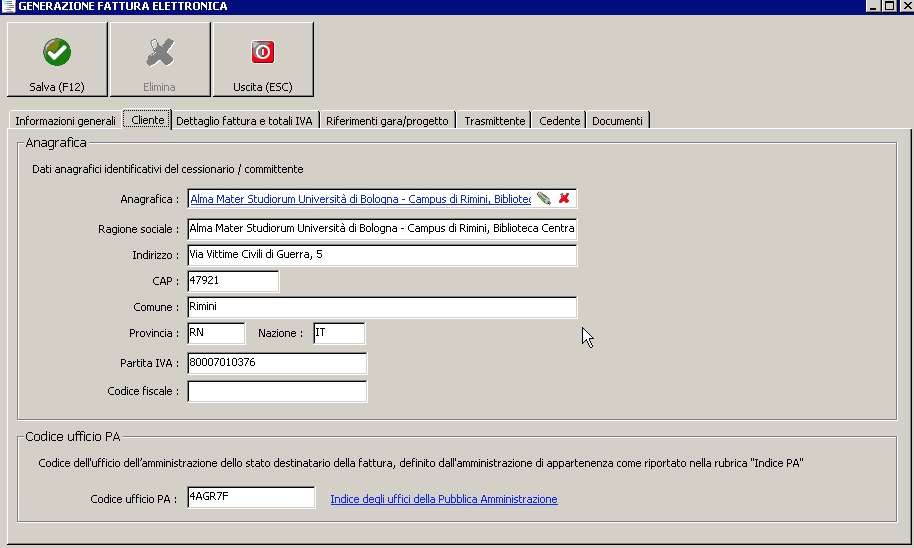 Ciao Fabio, ho fatto la prima fattura PA. Il nostro cliente (universita di bologna) ha come direttiva di avere il campo del codice fiscale obbligatoriamente compilato (1.4.1.2) e se vogliamo possiamo inserire anche la partita iva (nel campo 1.4.1.1).