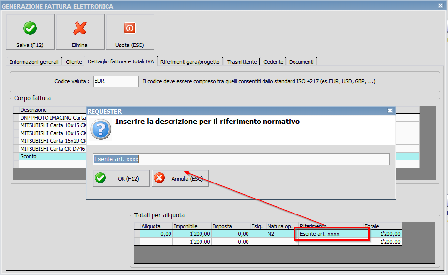 In particolare sull'esportazione dei totali per aliquota viene ora utilizzata la descrizione estesa dalla tabella imposte per la normativa di riferimento. In caso di necessita' la descrizione e' inoltre personalizzabile manualmente sulla singola fattura elettronica (la modifica va chiaramente effettuata PRIMA di generare il file XML)