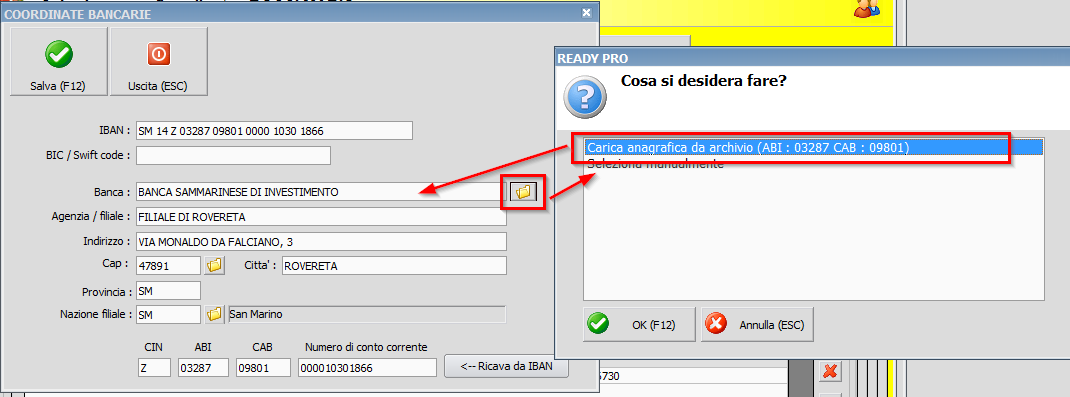 Sarebbe anche utile avere la compilazione automatica o dietro pressione di altro tasto "Ricava da IBAN" per compilare i campi BANCA, FILIALE / AGENZIA, INDIRIZZO, CAP, CITTA', PROVINCIA, NAZIONE FILIALE (cosa che avviene ora inserendo a mando ABI e CAB nel tasto ARCHIVIO BANCHE.