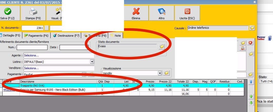 salvando questo documento, l’ordine a cliente risulta “evaso” (non parzialmente) e difatti anche la linea del trasporto risulta già convertita (colonna “residuo” pari a)
