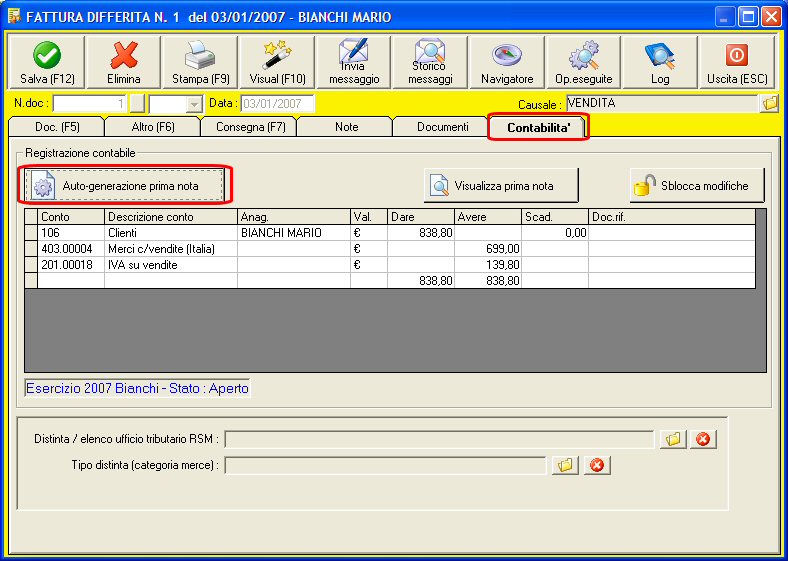 Citazione: Ora entrando sulla fattura emessa, dentro l'etichetta CONTABILITA' troverai un pulsante AUTO-GENERAZIONE PRIMA NOTA. Cliccandoci sopra Ready ti creerà una registrazione in Prima Nota in base alla causale ed ai conti preconfigurati.