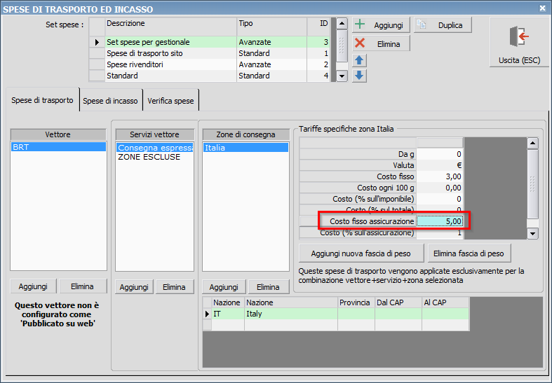 Buongiorno ragazzi, Ho una domanda riguardo le spese di spedizione con assicurazione. Mi è sembrato di capire che non è possibile inserire un costo fisso per l'assicurazione. Però la mia esigenza sarebbe proprio quella di inserire un costo fisso da variare in base agli importi di acquisto. Ho questa necessità perché i vari corrieri che adottiamo ci offrono proprio queste tariffe: ES. per importi da 0 fino a 1000,00 euro viene applicato un costo di 8,00 euro di assicurazione ecc.. L'alternativa potrebbe essere quella di impostare il costo dell'assicurazione esclusivamente sull'importo delle spese di trasporto? se è possibile, in che modo?