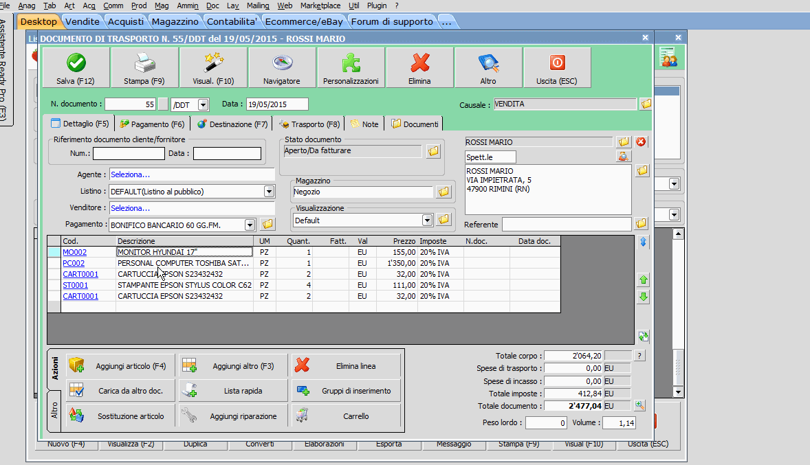 Modificando la visualizzazione potete mostrare il volume preso dall'anagrafica articolo, ma se il volume in anagrafica viene modificato riaprendo un documento di 1,6,12 mesi prima non si vedra' il volume che era presente quando e' stato creato il documento, ma sempre e solo il volume che e' presente nell'anagrafica di ogni articolo.