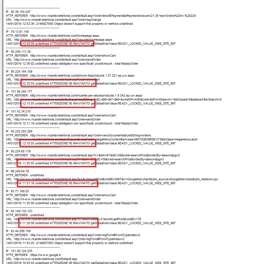 Questo errore non ha collegamento con il precedente. Lo svuotamenteo del carrello e' legato al fatto che IIS sul vostro web server si riavvia molto spesso (sempre per il problema di risorse gia' evidenziato e per il quale e' stato suggerito un upgrade di web server) In condizioni normali IIS dovrebbe invece riciclare i processi una volta al giorno (normalmente i server sono configurati per farlo alle 4 del mattino) mentre nel vostro caso avviene un riciclo dei processi anche ogni 15-20 minuti, e quando questo avviene tutti i clienti che stanno elaborando un ordine o inserendo dei prodotti a carrello si troveranno automaticamente de-autenticati