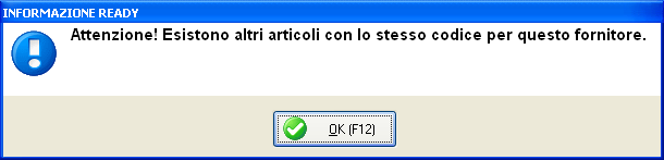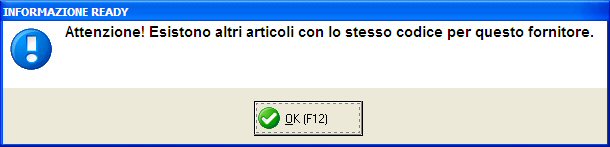 Guarda che Ready non ti impedisce di inserire 2 o piu' codici fornitore uguali... Semplicemente quando inserisci 2 codici fornitore uguali ti avvisa con un messaggio come quello qui sotto. Ma poi, correggere o controllare, sta a te. Se non correggi il programma ti permette di creare anche 100 articoli con lo stesso codice fornitore.