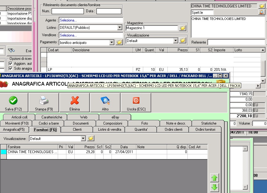 Buongiorno, ho un problema con l' aggiornamento prezzi e mi è già capitato prima. Riassumo. Ho registrato una fattura estera con i prezzi di acquisto, solo in seguito mi sono accorto di aver inserito la cifra IVA esclusa al posto di quella IVA INCLUSA. per cui sono andato a sostituire la cifra del totale iva compresa aggiornando così i prezzi all' interno del corpo. Il problema è che nel campo "fornitore" di ogni singolo articolo è rimasto il prezzo sbagliato precedente, prezzo da cui ovviamente calcola il listino (minimo di acquisto) e anche reinserendo uno a uno i prezzi nel corpo della fattura quel valore non cambia più!!! Devo andare nel campo "FORNITORE" di ogni singolo articolo e modificarlo a mano!!! Vi allego uno screenshot esemplificativo