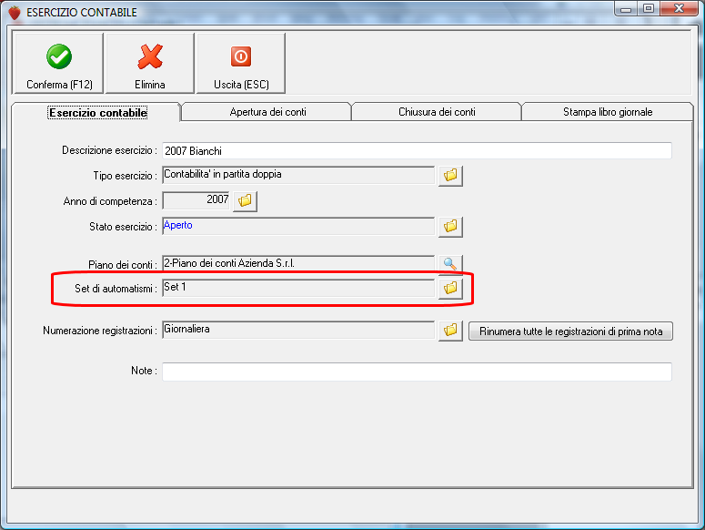Citazione: mi compare il messaggio "nessun set di automatismi" Significa che non hai impostato in AMMIN / GESTIONE ESERCIZI CONTABILI / MODIFICA il set di automatismi creato