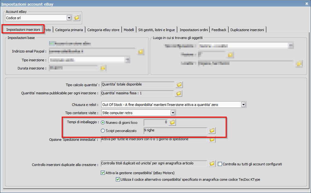 Citazione: lo script è questo : Rdy.EbayAccount("ilmiostore").ExecuteSyncQtyPrice Non intendevo questo, ma se avete i tempi di consegna che sono configurati per essere calcolati con uno script (ma potreste anche aver inserito un tempo fisso, non so)