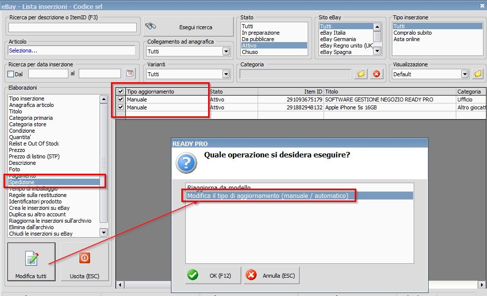 Buongiorno, ho modificato da automatico a manuale "il modello" cioè le impostazioni base per tutte le inserzioni " non ho modificato una per una ". Aspetto tuo riscontro, grazie. Saluti.