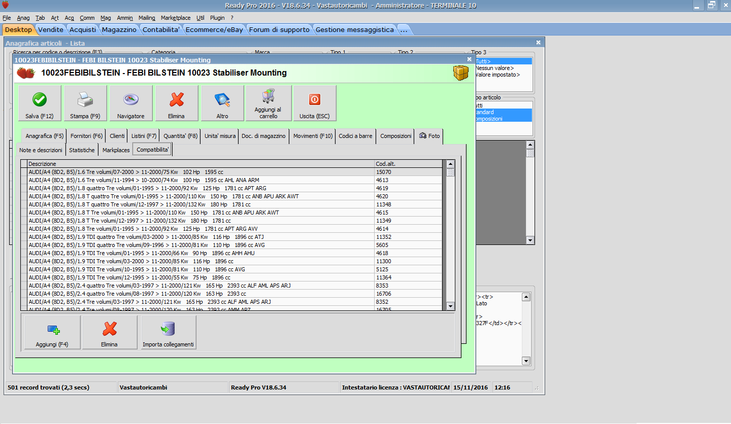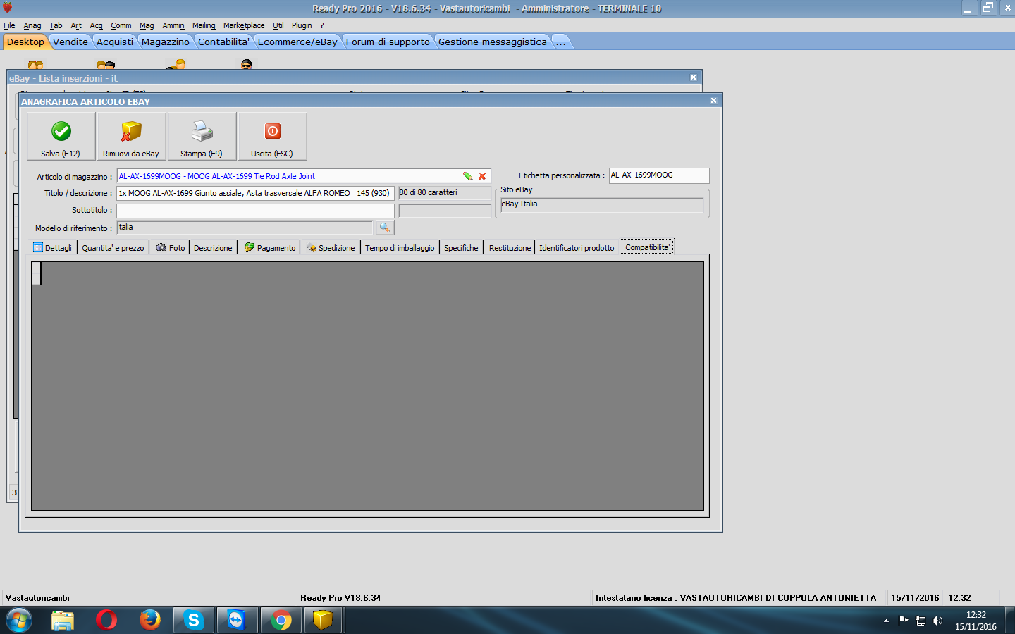 Nell 'anagrafica articoli sono state inserite tutte le compatibilita per ogni articolo, ma al momento in cui si va a pubblicare non si agganciano, ma se provo a modificarle a mano da ebay posso aggiungerle in allegato vi invio uno dei miei articoli di anagrafica con le compatibilita prima di essere pubblicata, e uno screen dopo che l'inserzione sia stata pubblicata. Non riesco a capire qualč la problematica, anche perche con gli altri account non ho questo problema, resto in attesa di una vostra risposta. Grazie