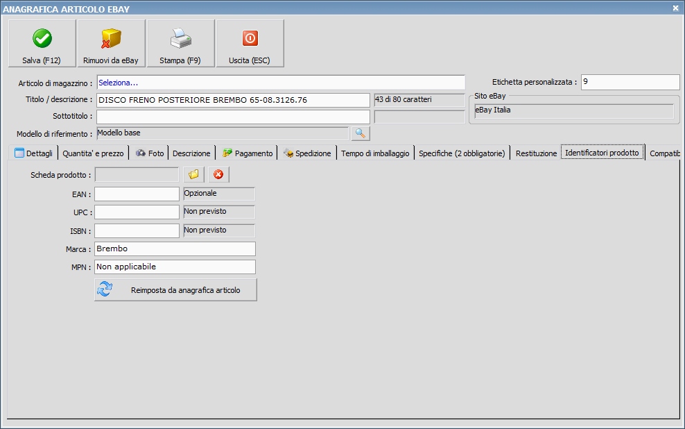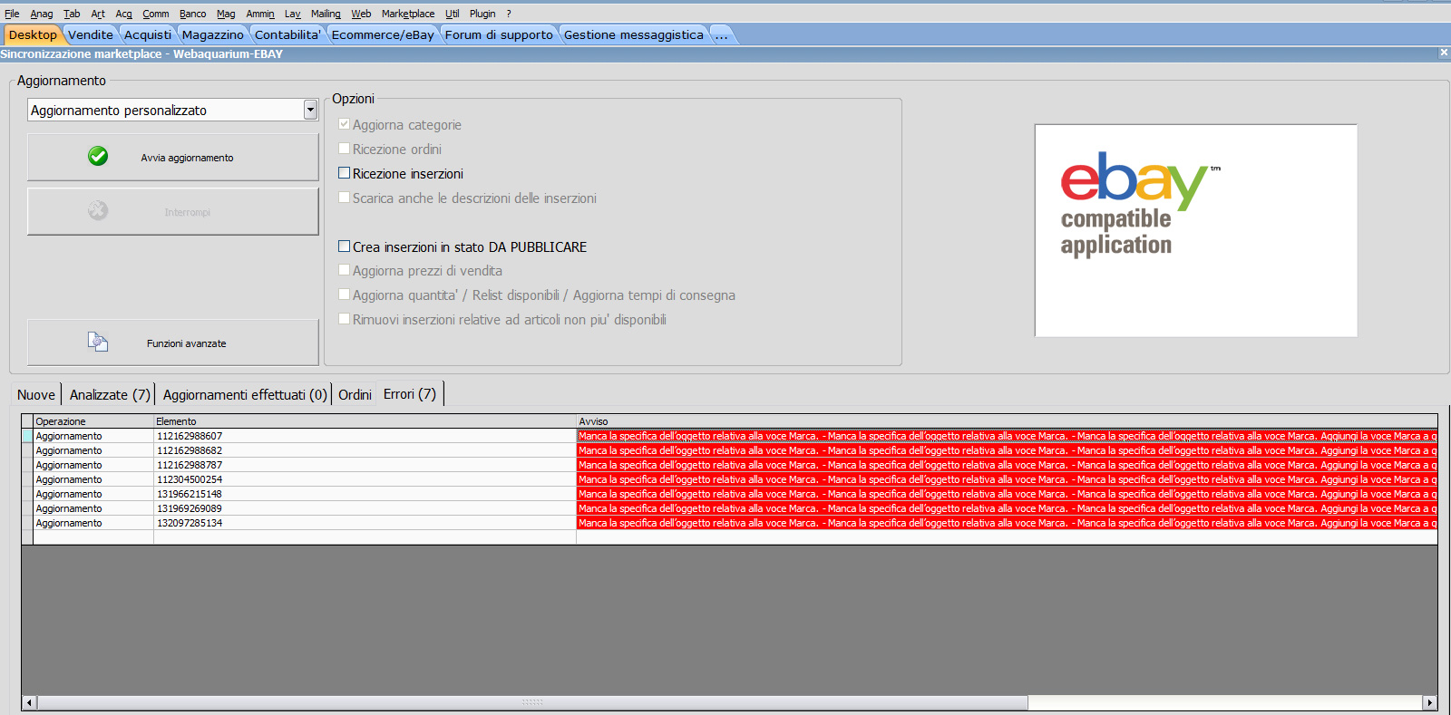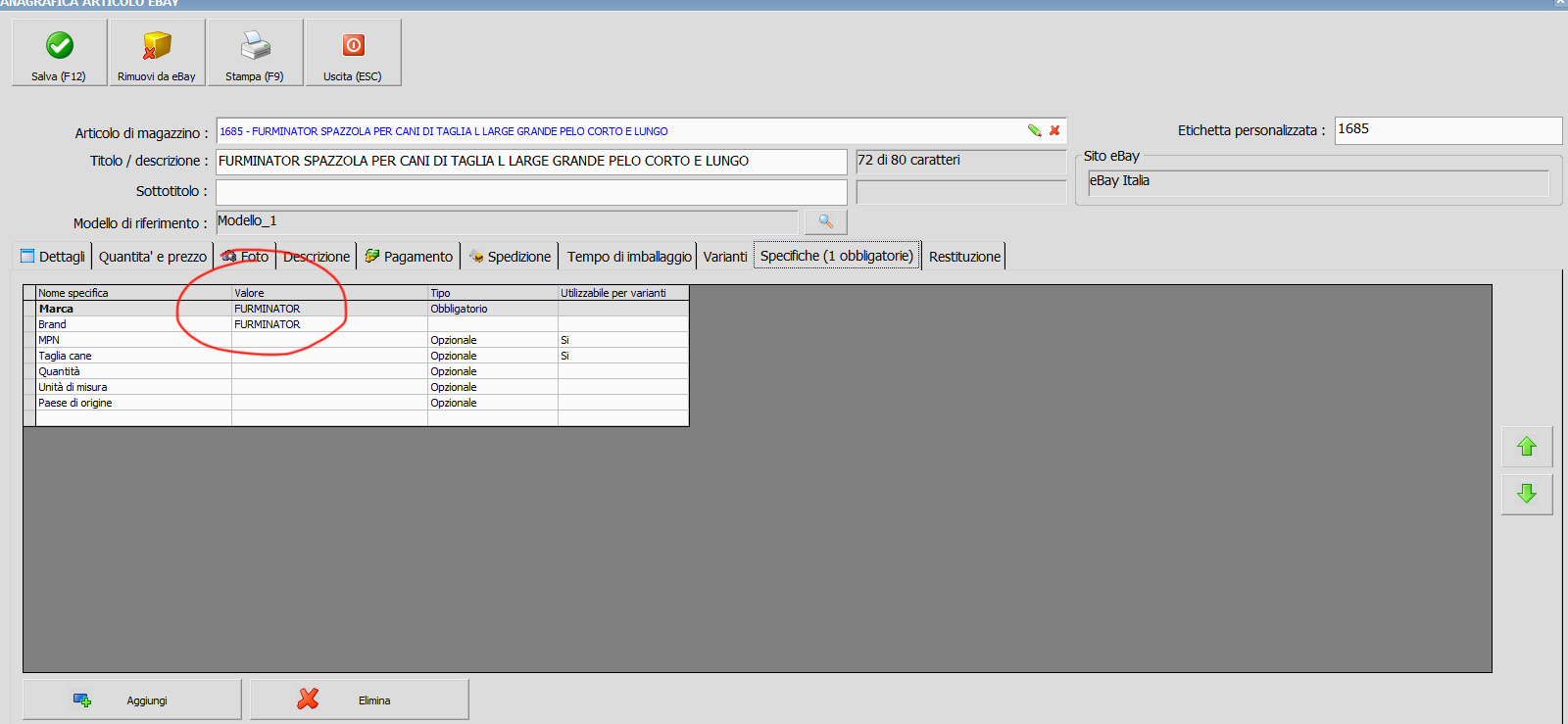 Buongiorno, sto riscontrando un problema da un cliente nella modifica massima di alcune inserzioni su Ebay. Nella precisione, dovrei modificare alcune categorie principali a diversi prodotti, ho quindi provato ad effettuare la modifica mediante elaborazione, dopodiché ho selezionato categoria primaria ed inserito la nuova categoria. Quando provo ad effettuare l'aggiornamento, mi restituisce un errore (per tutte le inserzioni elaborate) dove comunica che manca il campo "Marca" nelle specifiche, ma ho controllato all'interno del prodotto e risulta regolarmente, infatti se apro l'inserzione manualmente e faccio la modifca manuale funziona correttamente. Ti allego le due screenshot.
