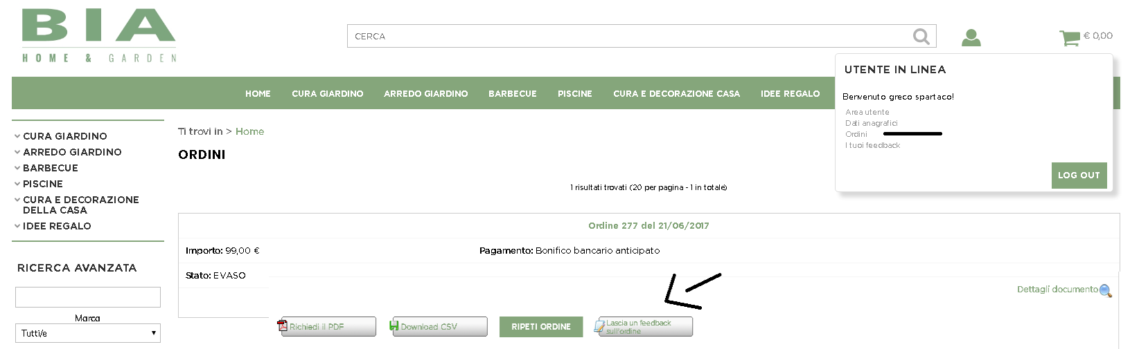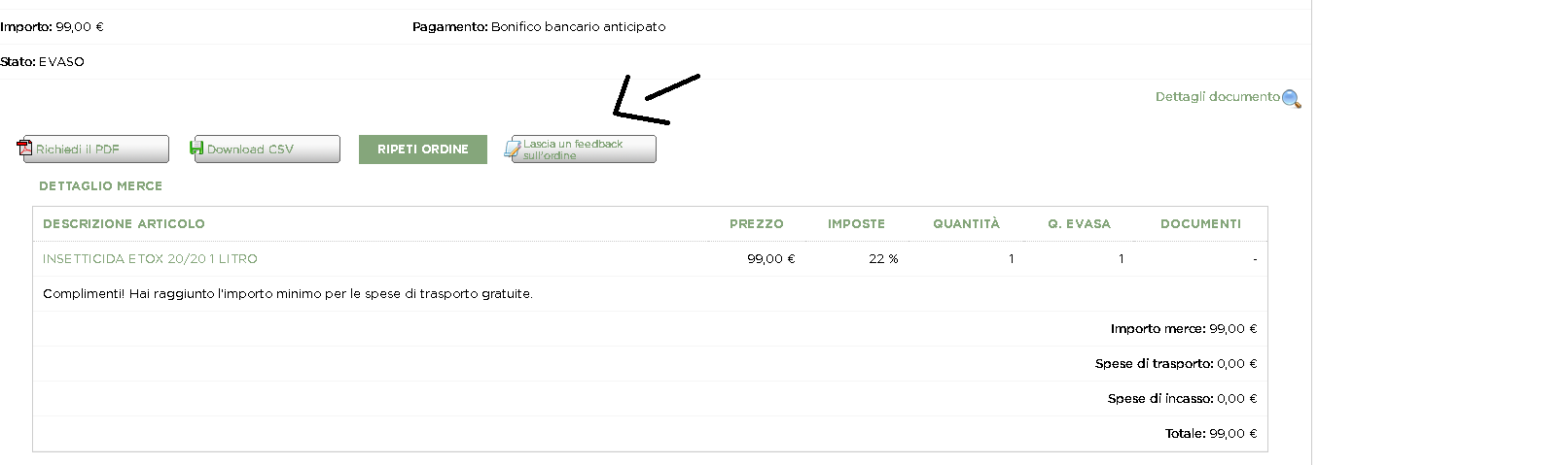 Buongiorno, A seguito di una vendita il nostro server genera automaticamente delle email per i nostri clienti del sito online per ringraziarli di aver acquistato da noi e per chiedere di lasciare un feedback. Nell'email allegata qui sotto c'è un link che collega al nostro sito nella pagina "I TUOI FEEDBACK" . Però non c'è nessun tasto che faccia lasciar un commento, o che faccia capire che per lasciare il feedback bisogna andare nella pagina ordini, e poi dettagli documento (Come raffigurato nella foto).