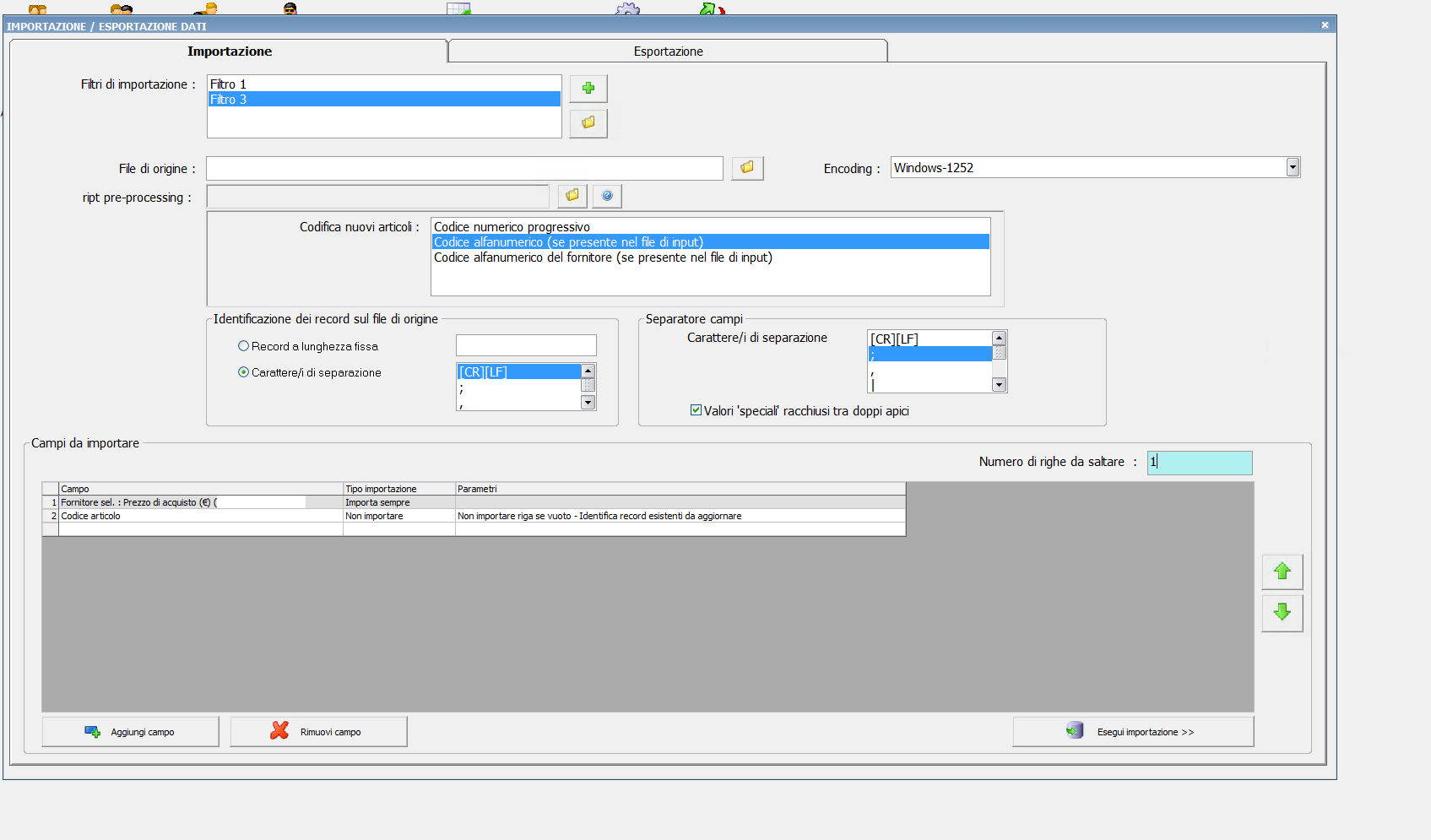 Nota: se non avete dimestichezza con i filtri di importazione dovreste fare prima dei test su una copia dell'archivio dati, perche' una importazione fatta in modo errato potrebbe crearvi centinaia di articoli sbagliati oppure aggiornare centinaia di articoli in modo errato.