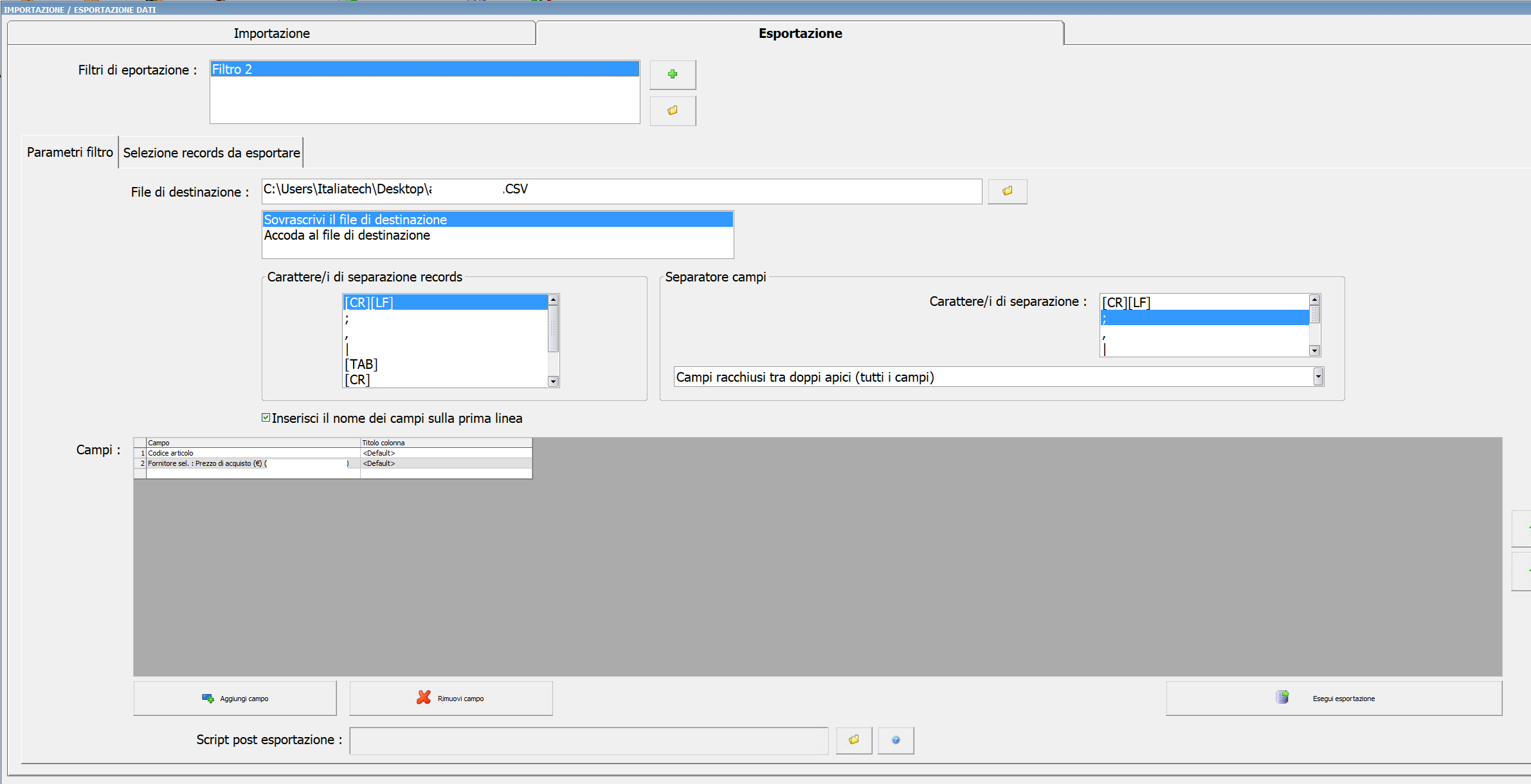 mentre il filtro di IMPORTAZIONE e' stato creato con i campi invertiti, ovvero