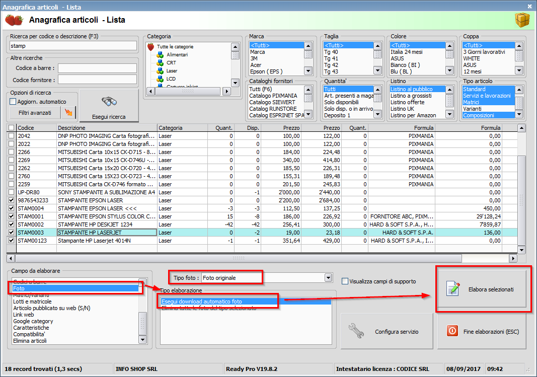 Parlando degli articoli gia' codificati a magazzino, da ELABORAZIONI si puo' forzare un download delle foto, come mostrato in figura In pratica il sistema analizza tutti gli articoli selezionati (sfruttando codici a barre, marca e codice produttore a seconda di cosa e' inserito in ognuno) e cerca di trovare una foto utilizzabile su IceCat. Se la trova la foto viene aggiunta all'anagrafica (ma solo se l'anagrafica non ha gia' una foto)