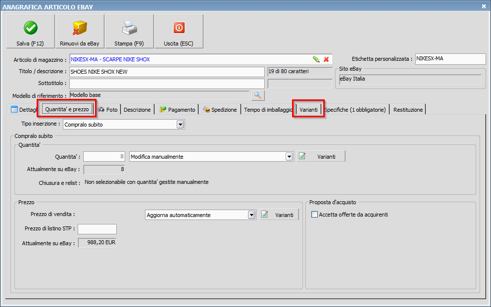 2) idem come sopra ma della sezione VARIANTI (sempre della stessa inserzione presa ad esempio chiaramente)