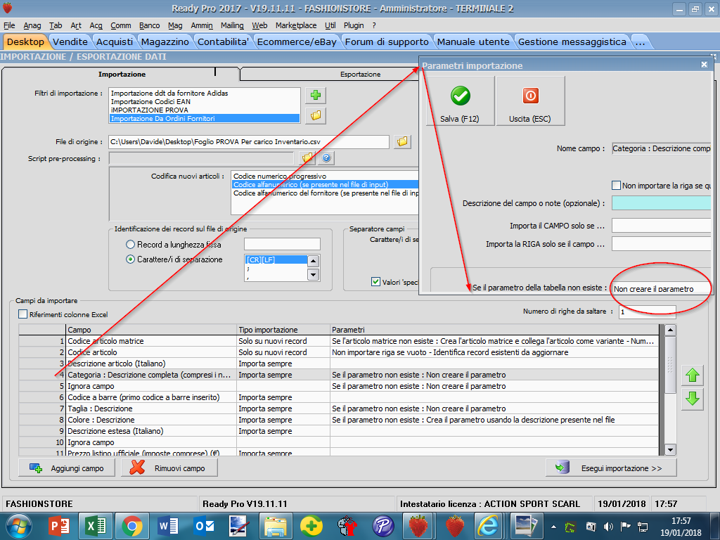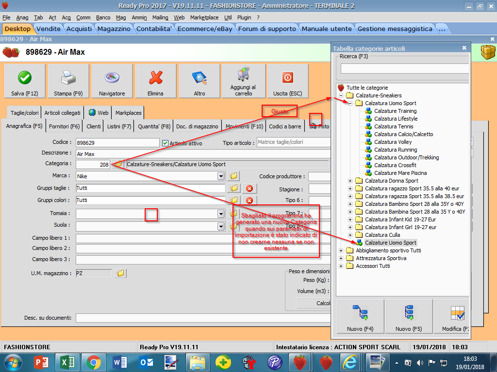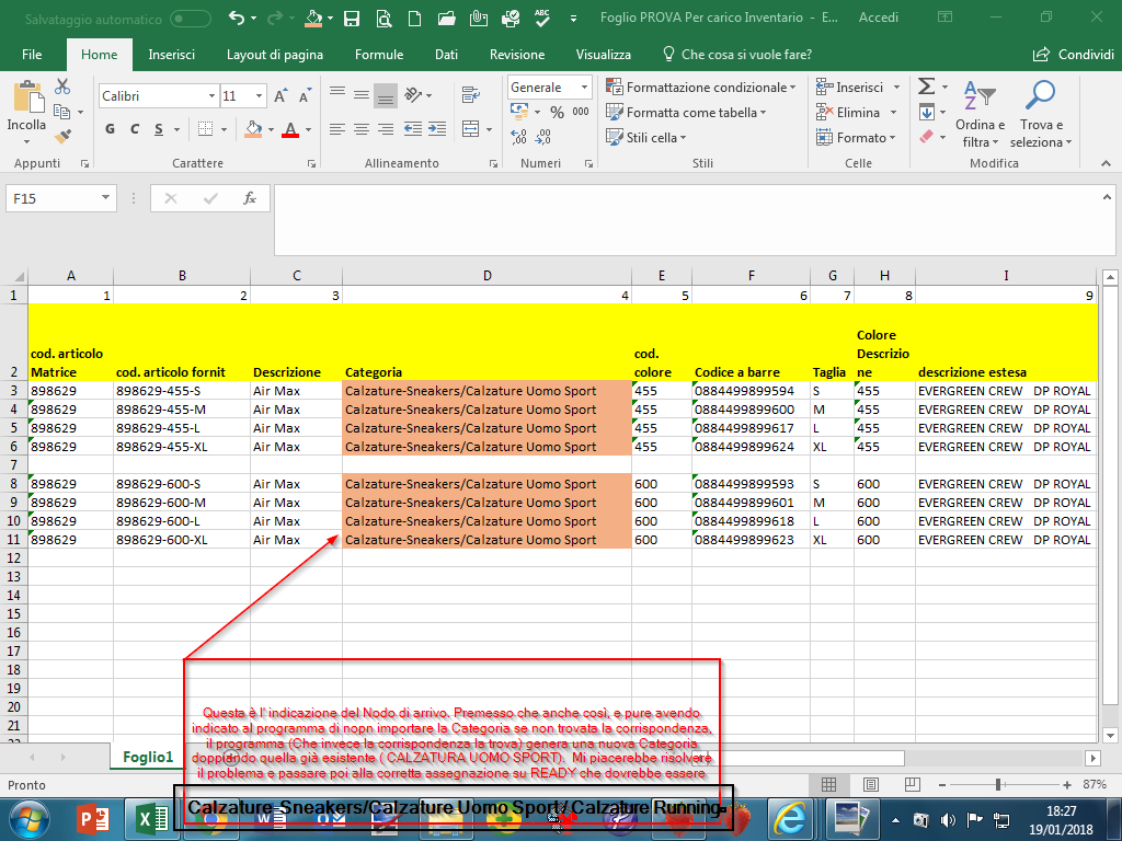 Buonasera fabio Capisco la Vs. esigenza di condividere i Treat e quindi di rappresentare le diverse tematiche su Treat diversi. Ma rimango perplesso quando sono pertinenti una medesima procedura, cmq mi adeguo. Se devo importare da un file Excell esterno la categoria da assegnare al prodotto su Ready, essendo sullo stesso già configurata un albero di categorie devo indicare sul Campo di Importazione I Nodi di Assegnazione su Ready Pro. Pertanto se Su Ready ho il seguente albero di categoria: 1- Calzature-Sneakers 1.1- Calzature Uomo Sport 1.1.1 Calzature Running e voglio indicare nel campo di importazione questa informazione, se non ho compreso male, dovrei inserire ( Calzature-Sneakers / Calzature Uomo Sport / Calzature Running ) Ho specificato nella procedura di importazione che nella ipotesi la categoria non fosse esistente su READY PRO, allora la procedura non deve importare la stessa. Peccato che però mi ritrovo pur essendo la Categoria esistente, doppiata o nuovamente creata la stessa. Puoi cortesemente spiegarmi cosa accade? Grazie mille. Ti allego gli screenshot e ilfile di excell