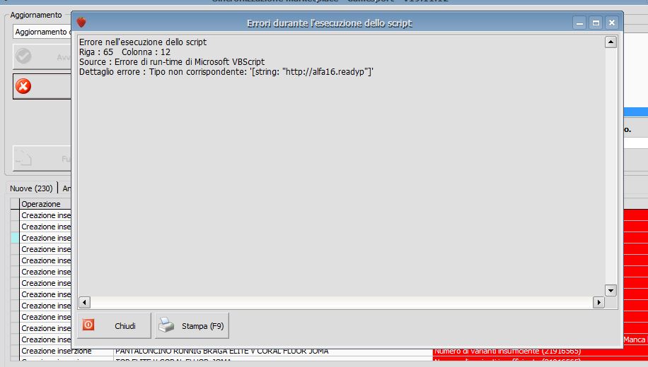 Questo errore e' dovuto ad un errore in uno script personalizzato che e' stato inserito. Senza vedere direttamente l'archivio e' purtroppo impossibile rispondere in modo preciso sulla sua origine. Trattandosi di sincronizzazione eBay potrebbe essere ad esempio uno script che calcola dinamicamente le quantita' da pubblicare, od uno script per il calcolo dei tempi di consegna. Vedo una parte di URL di un sito ecommerce DEMO, quindi se state utilizzando il plugin wonder per il template potrebbe anche essere che abbiate inserito un URL non valido da cui prelevare le immagini. Normalmente vi avrei consigliato di verificare in teleassistenza con uno dei nostri tecnici, ma vedo che il vostro contratto di licenza non e' stato rinnovato, e quindi non e' una strada percorribile.