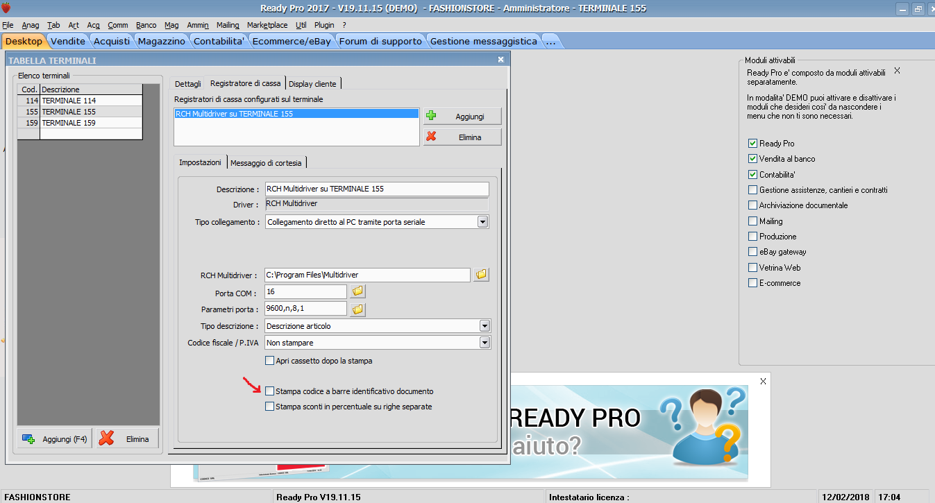 In pratica al momento dell'aggiunta del registratore di cassa alla tabella dei terminali, ho spuntato il flag stampa codice a barre identificativo documento che effettivamente al momento della stampa dello scontrino mi ha stampato. Il problema è pero nato quando ho provato ,tramite un lettore di codice a barre, a risalire al prodotto venduto per effettuare una resa; di fatto la lettura del codice a barre non mi fa risalire ad alcun prodotto e non mi apre alcun tipo di finestra. Inoltre se provo a tornare nella tabella dei terminali noto che il flag stampa codice a barre identificativo documento è ritornato al valore di default(0)