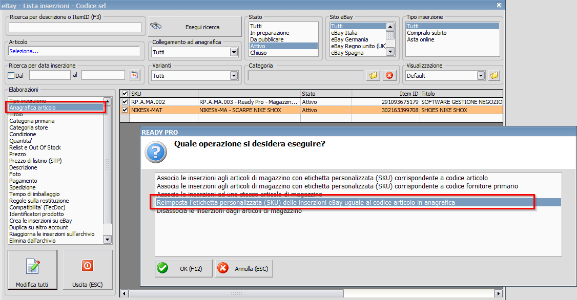 Ecco perchè prima avevamo chiesto: Associa le inserzioni ad uno stesso articolo di magazzino SENZA REIMPOSTARE L'ETICHETTA PERSONALIZZATA (sku) DELLE INSERZIONI EBAY AL CODICE ARTICOLO IN ANAGRAFICA