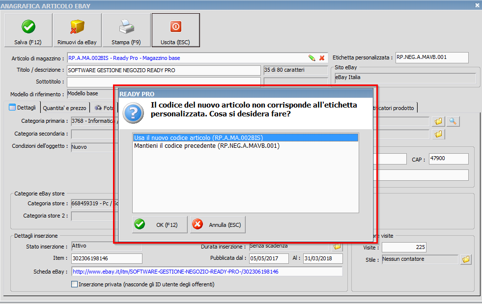 Ci spiaghiamo meglio. Come sapere ebay ultimamente vieta creare inserzioni doppie. Da esperienza personale ci siamo accorti che nonostante il titolo sia difforme ed anche l'anagrafica, ebay si rende conto che abbiamo inserzioni identiche. Come fa: semplice fa controlli sul codice fornitore e sul codice etichetta personalizzata. Vi chiederete come mai facciamo inserzioni doppie, benissimo, sapere che nel ns settore capita che un kit frizioni o ammortizzatori o distribuzione monta su più macchine (TecDoc) voi penserete, semplice basta indicare più codici di compatibilità ed il gioco è fatto, sbagliato perche alle volte capita che monta fino ad un determinato anno o magari vi sono delle note particolari. Noi giustamente creiamo tanti articoli quante sono le problematiche che si possano riscontrare. Ovviamente dopo aver creato le inserzioni le dobbiamo collegare ad un articolo principale che in caso di variazioni tipo prezzo, quantità, ecc, (escluso la descrizione ovviamente, che impostiamo in ogni caso in manuale). Ecco per cui ci serve che: una volta che colleghiamo l'articolo Ready non intervenga sull'etichetta personalizzata modificandola. A noi servirebbe un'operazioen del tipo: