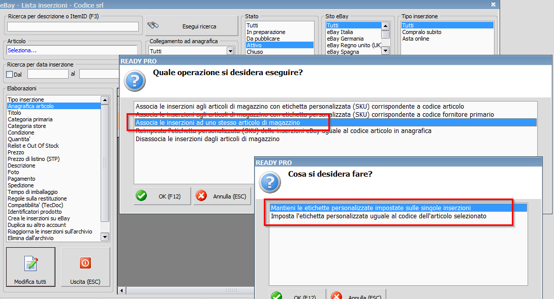 In ogni caso, se le inserzioni sono create con qualche sistema di terze parti l'unico suggerimento che posso darvi e' di avere l'accortezza di andare a modificare l'etichetta quando associate articolo ed inserzione (il che e' necessario solo la prima volta, quando associate una inserzione che e' stata creata NON da Ready Pro con l'anagrafica, perche' poi viene mantenuta quella etichetta). Altre strade non ci sono (se non, come gia' detto, di creare le inserzioni partendo da Ready Pro)