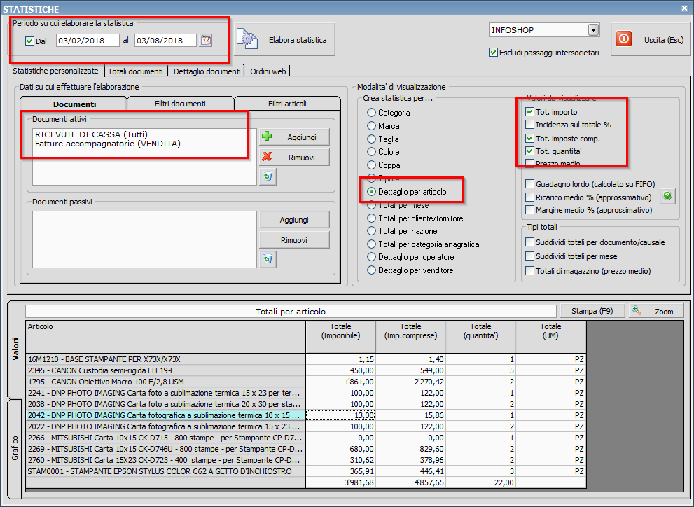 Altrimenti, genericamente parlando, la via semplice e' di utilizzare la procedura AMMIN / STATISTICHE, e da li' generare un report per articolo, indicando il periodo DAL ... AL .... ed il tipo di documenti su cui fare la statistica.