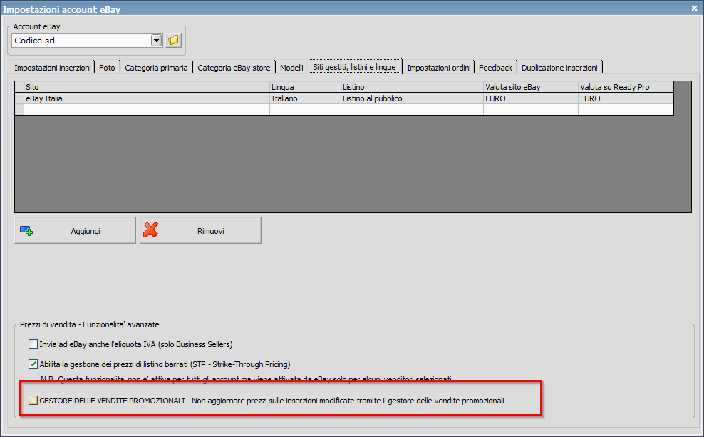 Come temevo viene fatta una analisi delle regole sulle promozioni. Utilizzate il gestore delle vendite promozionali su eBay per creare sconti su inserzioni specifiche?