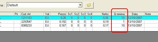 Citazione: che è quello con il prezzo più conveniente. Non dipende dal fatto che è il prezzo più basso. Prova ad eseguire un carico di magazzino con quantità inferiori a 10. Vedrai che inserirà 2293547 perché hai specificato una quantità minima per cui è valido quel prezzo. In questo modo se aggiungi una quantità uguale o maggiore a 10 Ready preleva l'ultimo valore valido nella griglia. Quindi quello che devi modificare è la "Q. minima" oppure cancellare quella linea doppia!