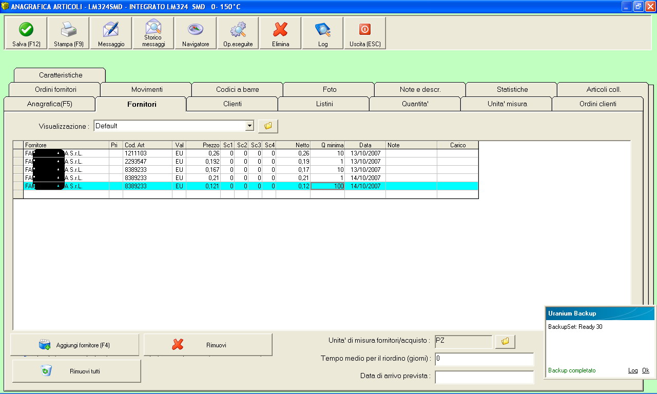 Perché stai usando una procedura che è destinata per tutt'altra cosa. Su anagrafica FORNITORI vanno inseriti i vari fornitori ed i relativi prezzi di acquisto. Aggiungendo più volte lo stesso fornitore si sfrutta la possibilità di impostare le fasce di prezzo. Invece tu vuoi usare questa procedura per inserire ALTRI ARTICOLI anche se simili. Quindi è ovvio che Ready non funzioni come ti aspetti.