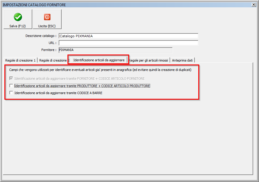3) Una volta caricato il catalogo del fornitore procedete con l'aggiornamento dell'anagrafica articoli. In questa fase se avete attivato l'opzione "Identificazione articoli tramite PRODUTTORE + CODICE ARTICOLO PRODUTTORE" (come da screenshot sopra) Ready Pro capisce che l'articolo del punto 1 e' lo stesso che e' in questo nuovo catalogo fornitore. Quindi Ready Pro non crea un secondo articolo, ma trattandosi dello stesso prodotto aggiunge il codice EAN all'anagrafica che gia' esiste E cosi' arrivate a trovarvi nella situazione che avete indicato all'inizio