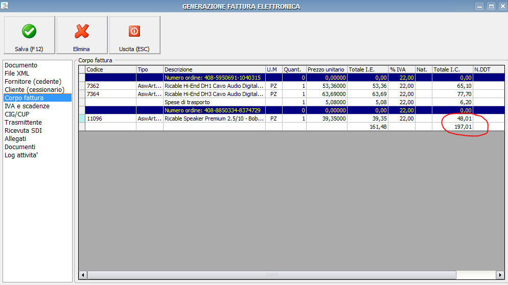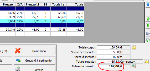 Nello specifico, il cleinte ha pagato 197 Euro inclusa, che riusciamo a far tornare nel totale fattura, solo impostando l'IVA con il calcolo per corrispettivi.