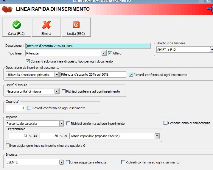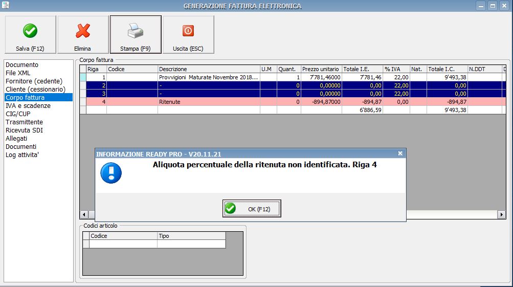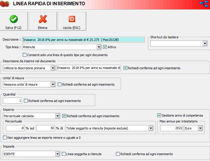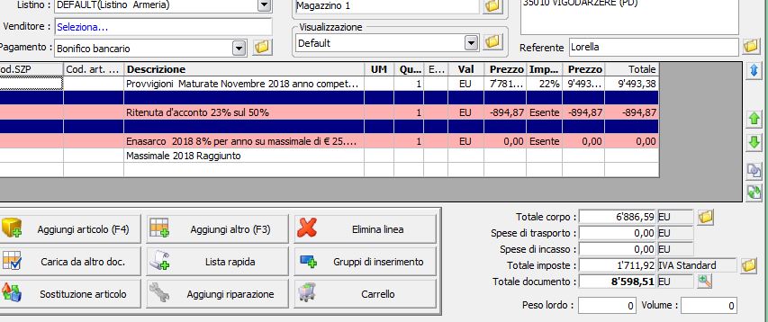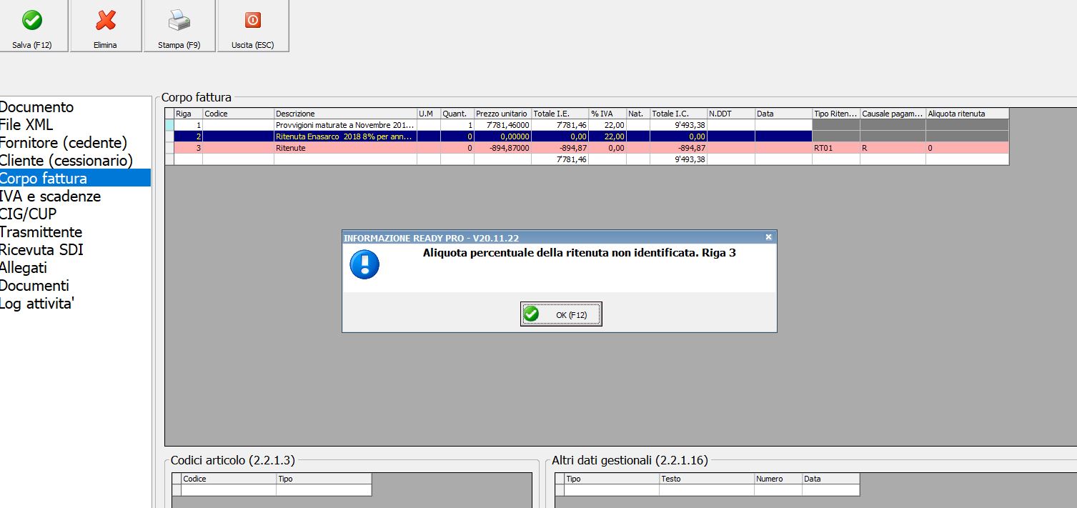 Buon giorno, uso ready sia per fatture elettroniche del negozio , che per fatture elettroniche delle provvigioni maturate per una ditta di cui abbiamo rappresentanza , sempre stessa partita iva per entrambi , chiarito questo , non riesco emettere fattura in merito alle provvigioni ditta mendante , in quanto mi da errore sulla compilazione Delle ritenute , vedi scren compilazione fattura e relativa generazione elettronica : JPG2, poi screen delle line documenti sia per ritenuta acconto , che per enasarco JPG4 e JPG3, alla fine nella generazione della farttura elettronica , nelle righe la dicitura enasarco non appare nessuna scritta , anche se metto un valore massimo enasarco , partendo con fattura 1 del 2019, non tiene conto che le fatture corrispondono a provvigioni del 2018 , e su questo possiamo mettere zero per ovviare , mentre sulle ritenute acconto mi da errore come da scren JPG. Poi osservazione l'enasarco non è una ritenuta ma un previdenziale non esiste una dicitura specifica . Come posso risolvere grazie