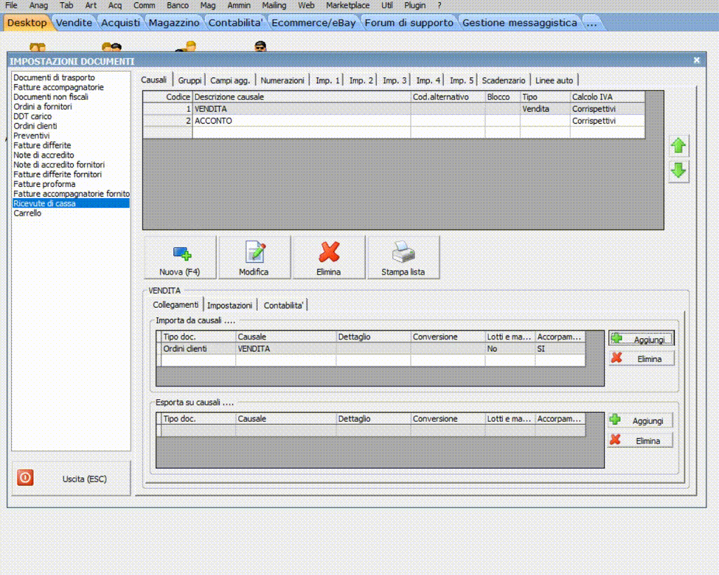 Citazione: la finestra sopra e' la procedura UTIL/IMPOSTAZIONI DOCUMENTI da cui si possono creare i collegamenti tra le causali