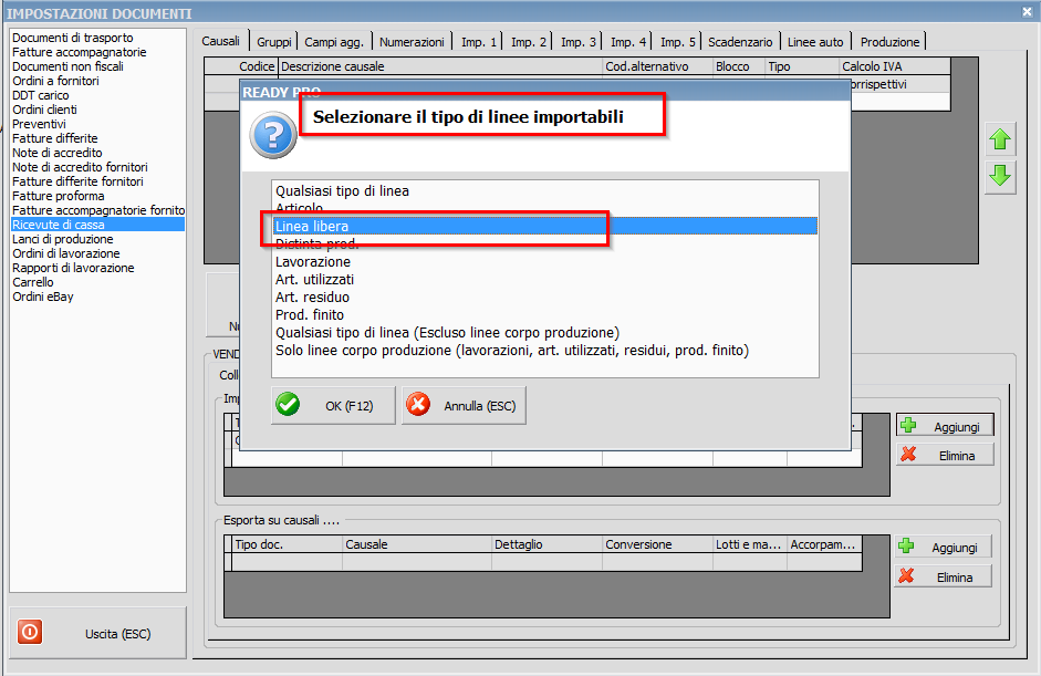 Si sto collegando ricevute di cassa sempre con ricevute di cassa praticamente sono su causale acconto e vorrei esportare in causale vendita ma non mi da l'opzione di scelta della linea libera solo messaggio che non si può fare. Anche se provo da vendita e selezione per importare da acconto stesso messaggio! Sbaglio qualcosa ? Grazie